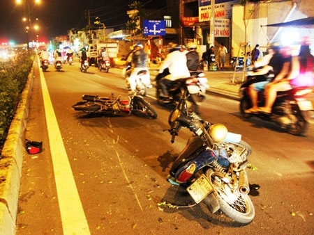 Khi đến gần đường số 25 (phường Hiệp Bình Chánh, quận Thủ Đức), xe máy của hai thanh niên tông cực mạnh vào xe máy chạy cùng chiều. Xe này do anh Hòa (30 tuổi, quê Cà Mau) điều khiển, chở theo ông Nguyễn Văn Mết (60 tuổi, ngụ quận 2). Cú tông mạnh khiến 4 người té xuống đường, hai thanh niên cùng anh Hòa bất tỉnh, ông Mết bị xây xát nhẹ.
