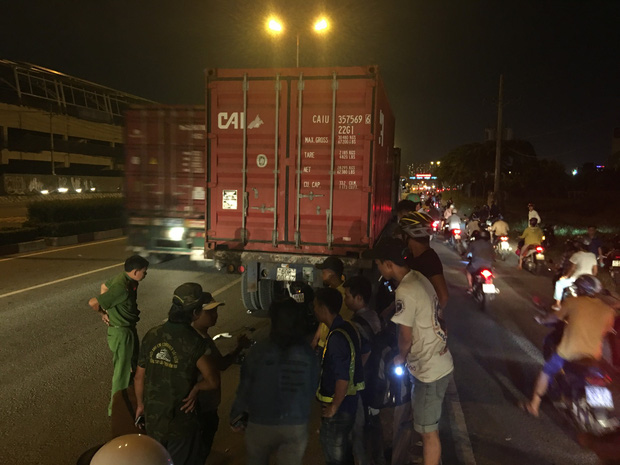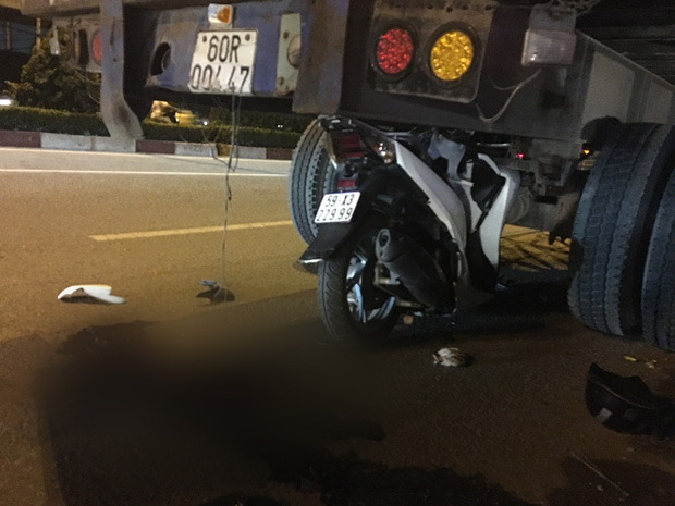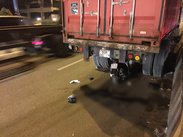 Người dân đi đường phát hiện đưa nạn nhân đi cấp cứu nhưng không qua khỏi. Tại hiện trường, xe máy dựng đứng, dính chặt dưới gầm đuôi container và hư hỏng nặng, nhiều mảnh vỡ văng trên đường.