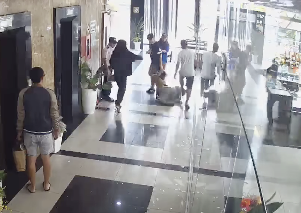 Người phụ nữ đi cùng nam thanh niên cũng liên tục chỉ mặt và đánh nạn nhân trước sự chứng kiến của bảo vệ chung cư và nhiều người xung quanh.