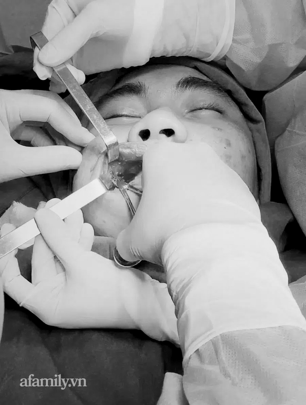 Cả ê-kíp phải cẩn thận vét sạch từng chút các mảnh silicon công nghiệp dính chặt trong các thớ thịt của bệnh nhân, bơm rửa và làm sạch toàn bộ ổ dịch trong máu để tránh nguy cơ hoại tử gương mặt.