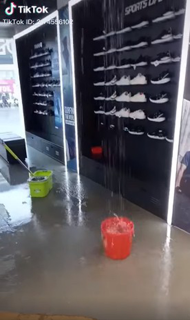 Nước dột quá nhiều khiến sàn nhà ướt nhẹp, lênh láng. Các nhân viên của shop mang xô chậu ra hứng nước nhưng do trần dột tứ bề nên đành bất lực mặc kệ.