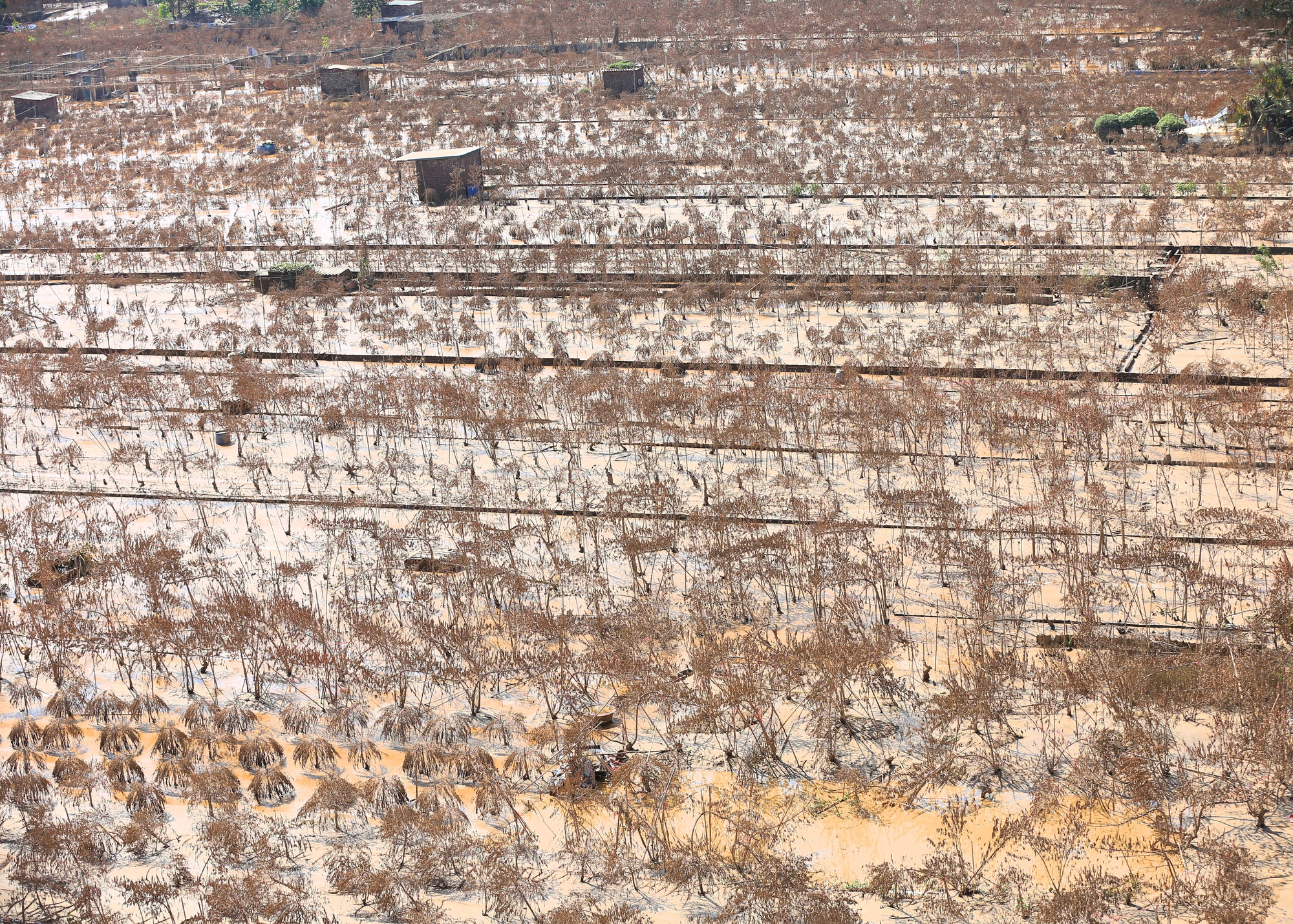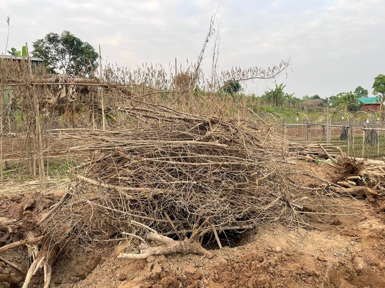 Ngày 10/10, sau hơn 1 tháng bị ảnh hưởng bởi cơn bão số 3, tại khu vực trồng đào Nhật Tân, Phú Thượng ven sông Hồng, những cành đào, gốc đào chết khô vẫn chất thành đống.