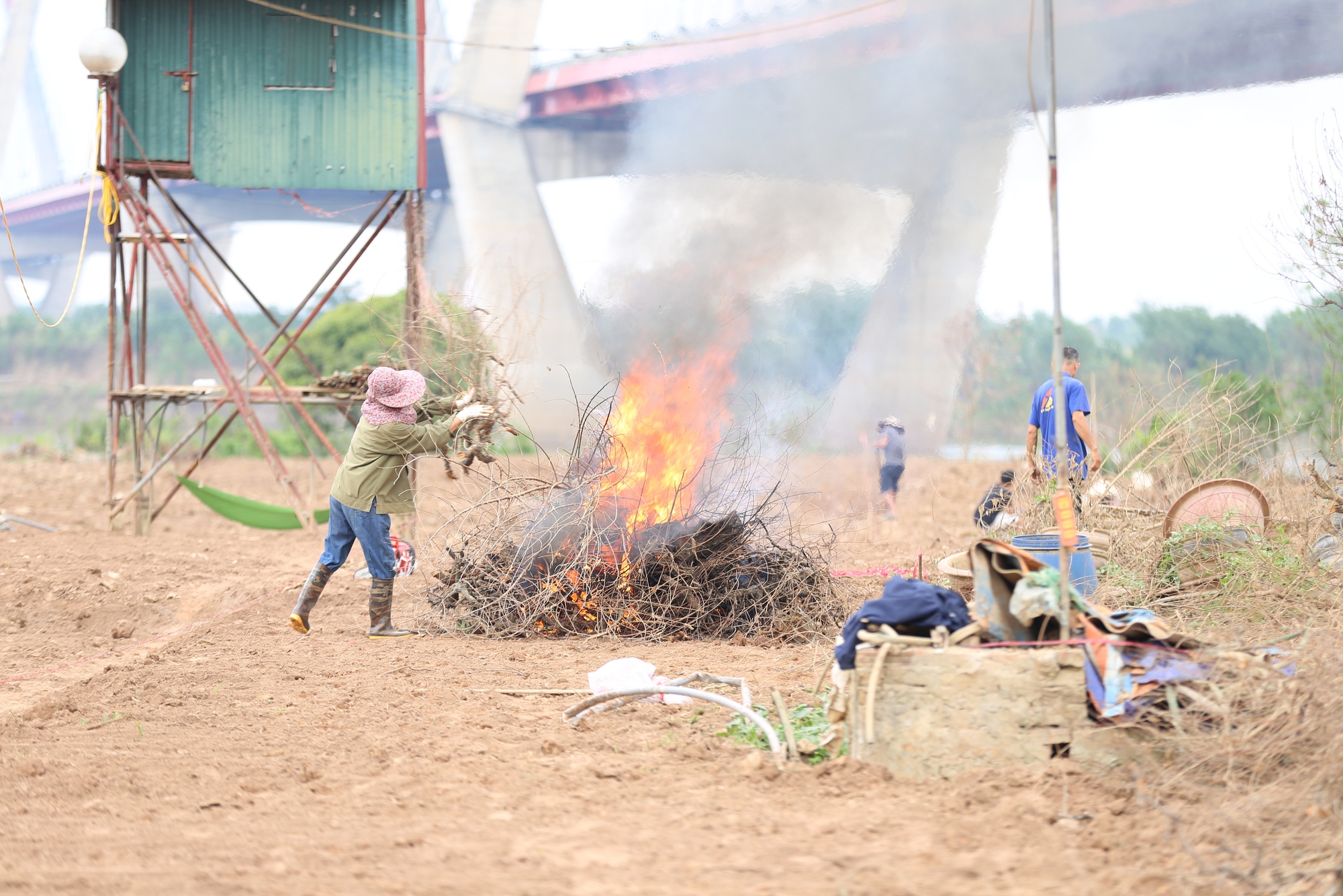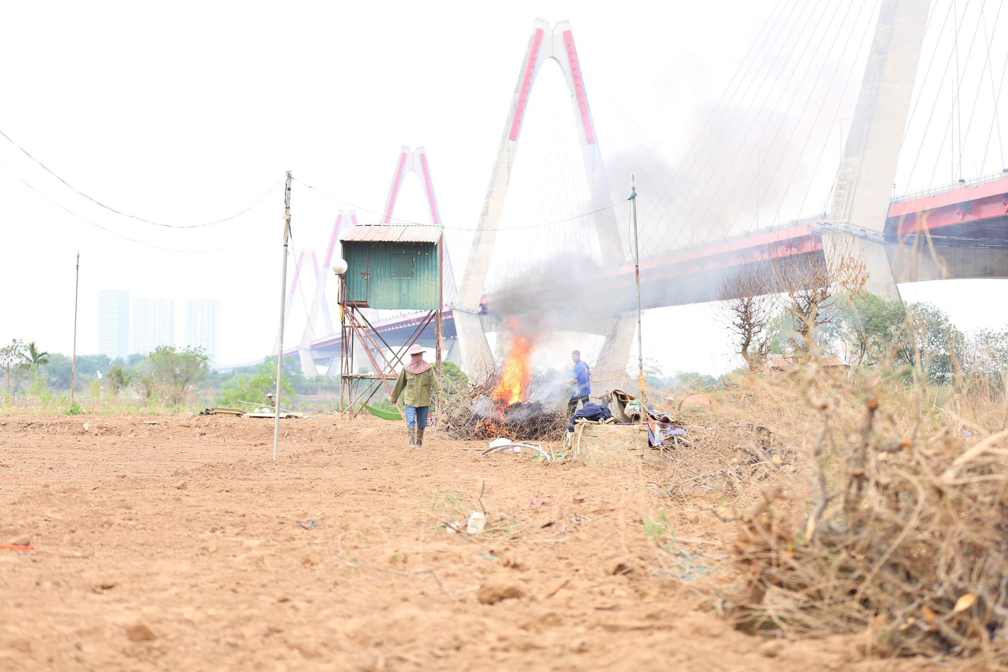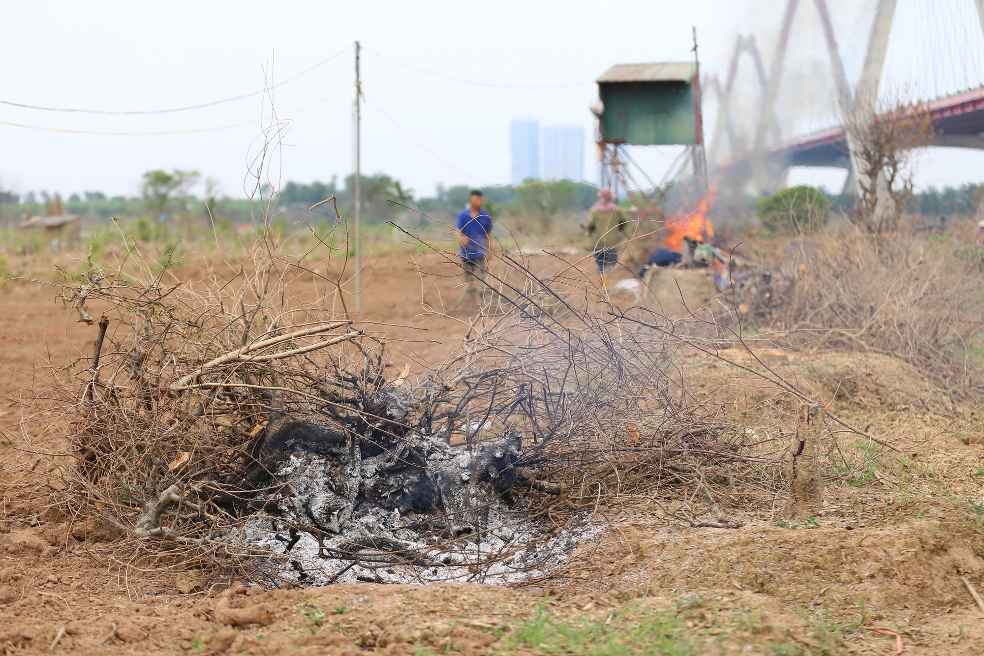 Tại vùng trồng đào thuộc phường Phú Thượng, anh Phú với nét mặt đượm buồn cùng vợ kéo những cây đào chết khô chất thành đống châm lửa đốt. Cách đó không xa là vườn của cô Hoa, từ một vườn đào xanh mướt hơn 600 cây nay chỉ còn là bãi đất trống đang được cải tạo lại.