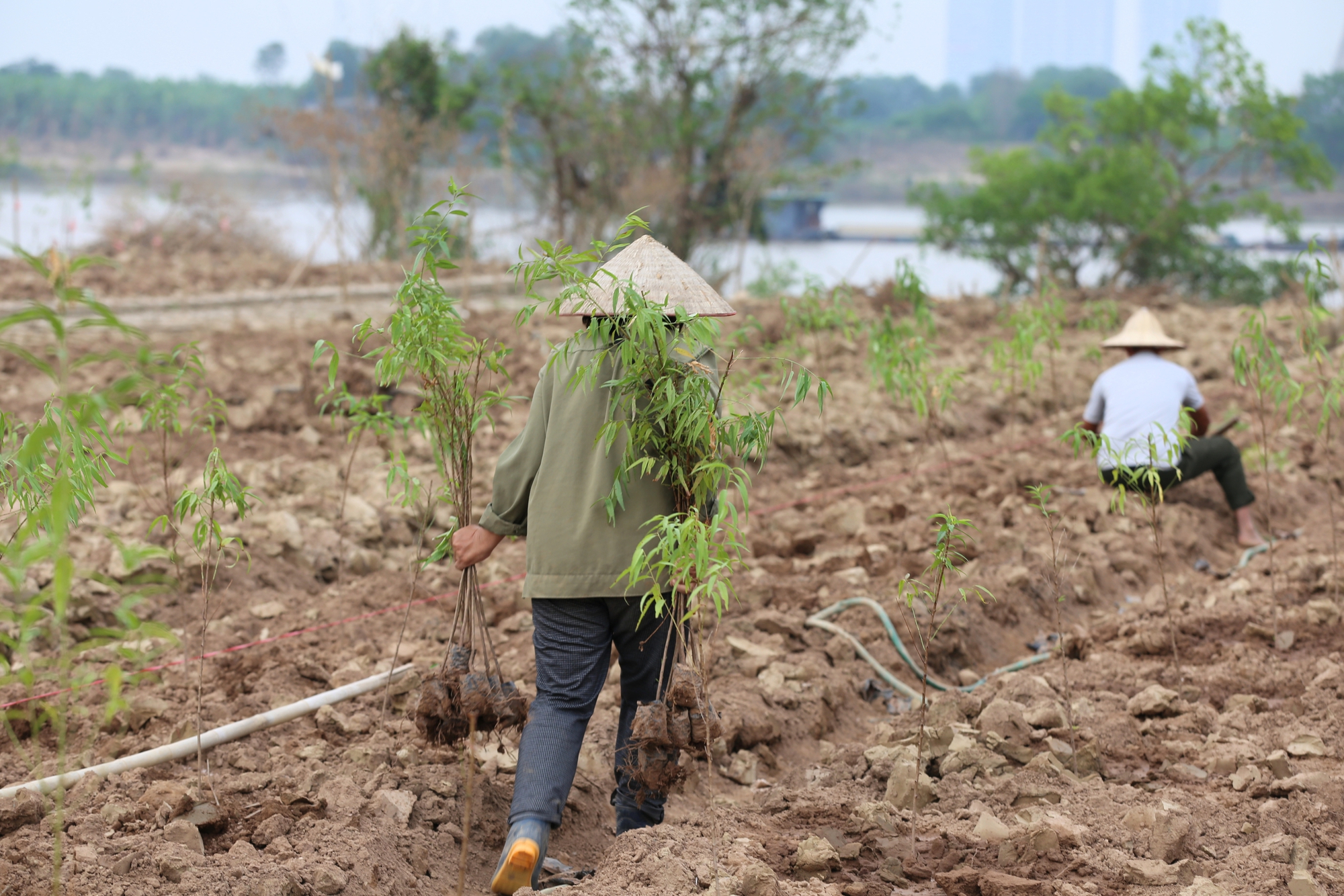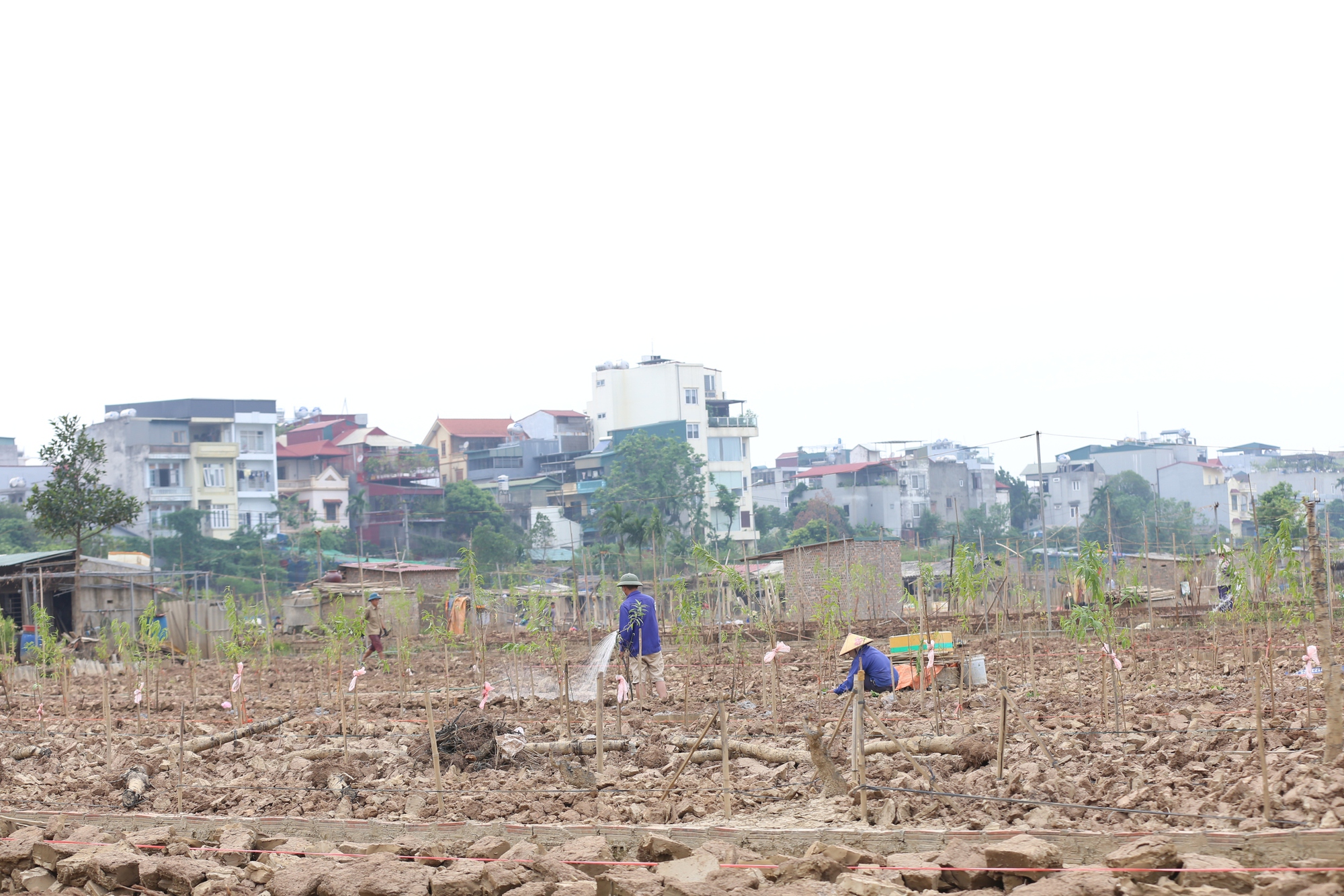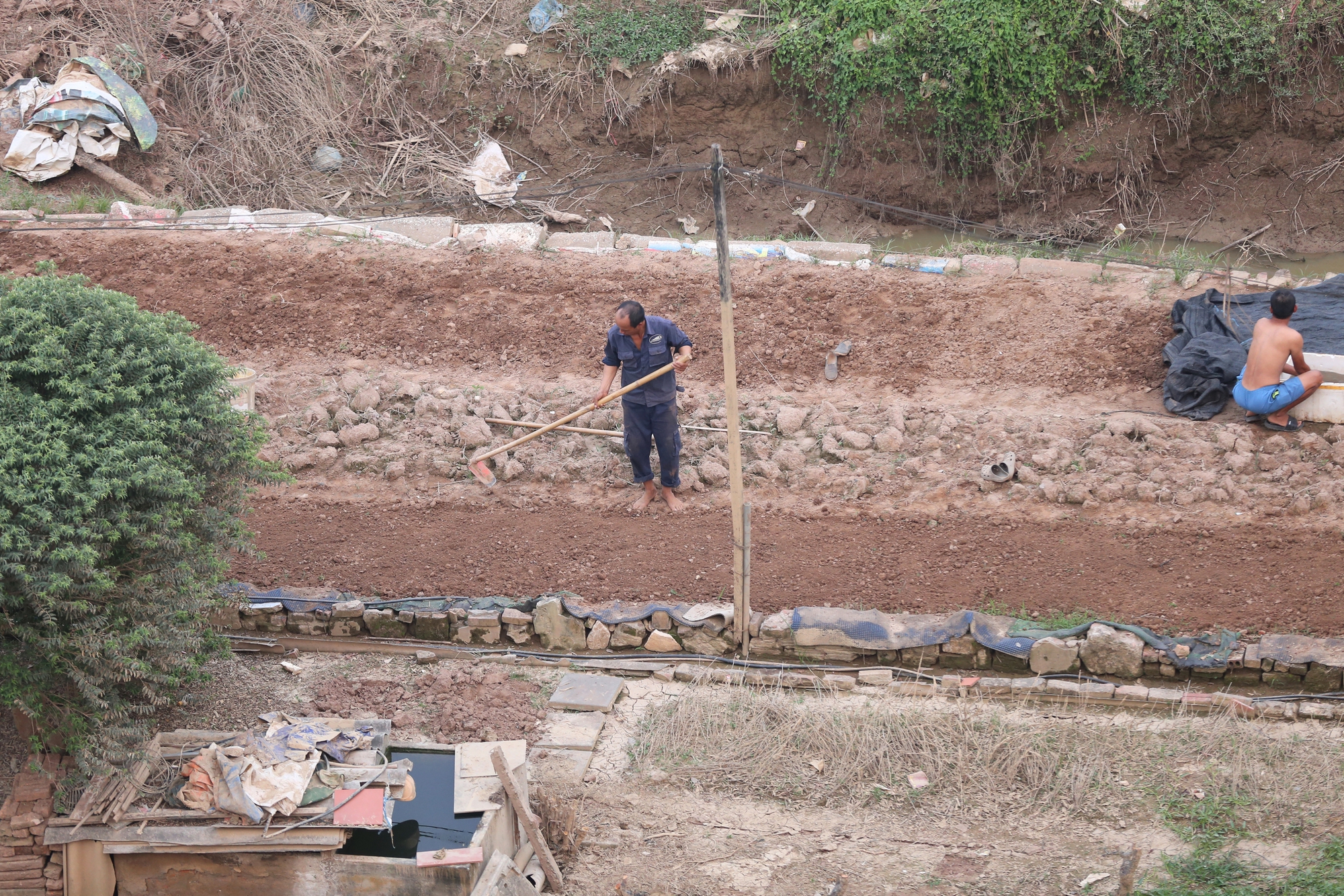 Theo đó, vào chiều cùng ngày, người dân trồng đào làng Nhật Tân, Phú Thượng cầm cuốc, xẻng,… ra vườn tiếp tục dọn dẹp, đào, xới đất để trồng cây, khắc phục hậu quả do bão lũ để lại.