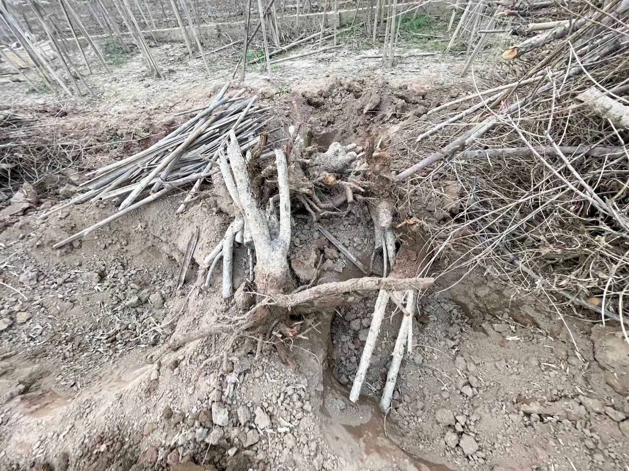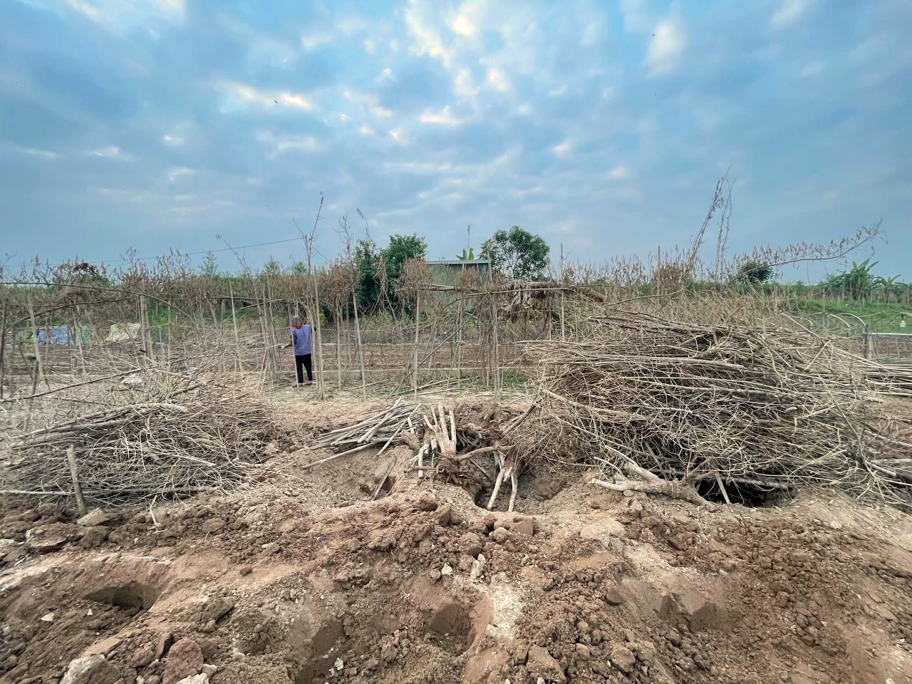 Tuy nhiên, năm nay do mất trắng nên cô Hoa cũng như những người dân trồng đào nơi đây phải chặt bỏ, đào xới những gốc cây đào chết khô, thay thế bằng những cây đào giống.