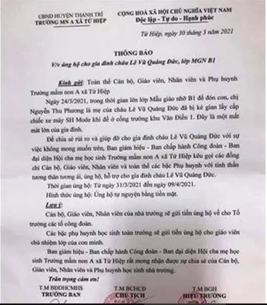 Để chia sẻ rủi ro và giúp đỡ gia đình cháu Đ. với sự việc không mong muốn trên, Ban giám hiệu, Ban chấp hành công đoàn và Ban đại diện Hội cha mẹ học sinh kêu gọi các cán bộ, giáo viên, nhân viên và toàn thể các bậc phụ huynh với tinh thần tương thân tương ái, ủng hộ, hỗ trợ cho gia đình cháu Đ. Thời gian ủng hộ từ ngày 31-3 đến ngày 9-4. Hình thức ủng hộ: Tự nguyện bằng tiền mặt...".
