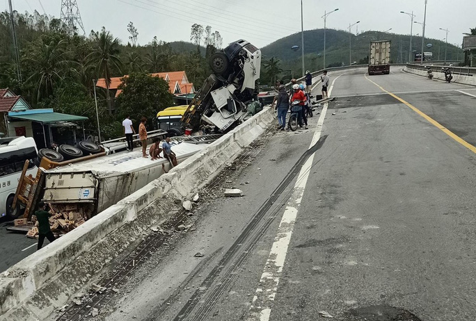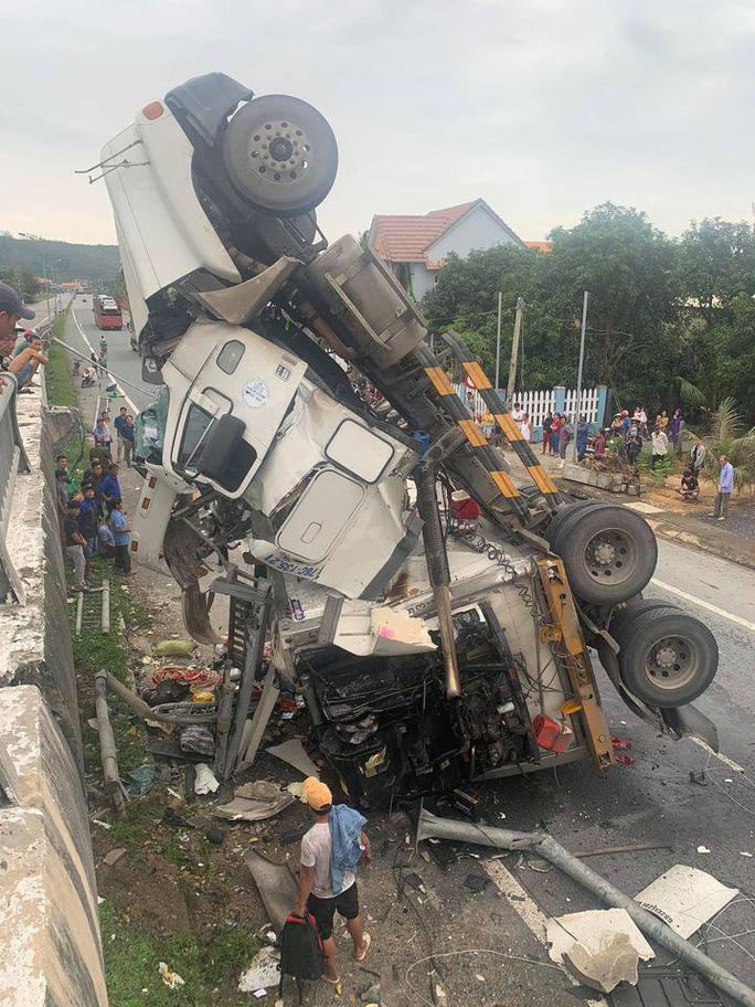 Tại hiện trường, cabin xe container bị hư hỏng nặng, nằm chổng ngược lên trời, thùng container nằm chắn ngang đường, hàng chục mét lan can cầu, cột đèn bị hư hỏng.