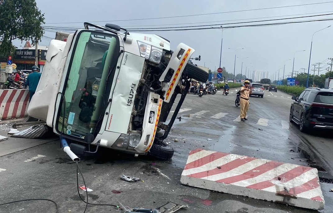 Tiếp đó, xe tải tông vào dải phân cách bê tông rồi lao qua làn đường ngược lại, lật ngang giữa đường.