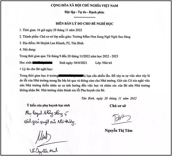 Ngay chiều 28/11, trường cho bé T.A. thôi học kể từ ngày 29/11 với lý do các cô ở trường vì quá áp lực nên đã xin nghỉ, không bảo đảm chất lượng chăm bé.