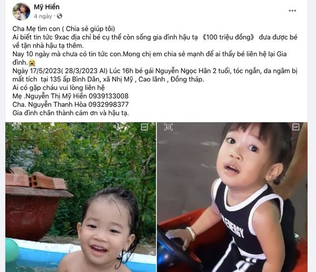 Liên tiếp những ngày gần đây, vợ chồng anh Nguyễn Thanh Hòa (37 tuổi) và Nguyễn Thị Mỹ Hiền (31 tuổi, cùng ngụ ấp Bình Dân, xã Nhị Mỹ, huyện Cao Lãnh, Đồng Tháp) đăng tải thông tin trên mạng xã hội, nhờ cộng đồng mạng lan tỏa thông tin tìm kiếm con gái Nguyễn Ngọc Hân - 30 tháng tuổi, mất tích gần nửa tháng.