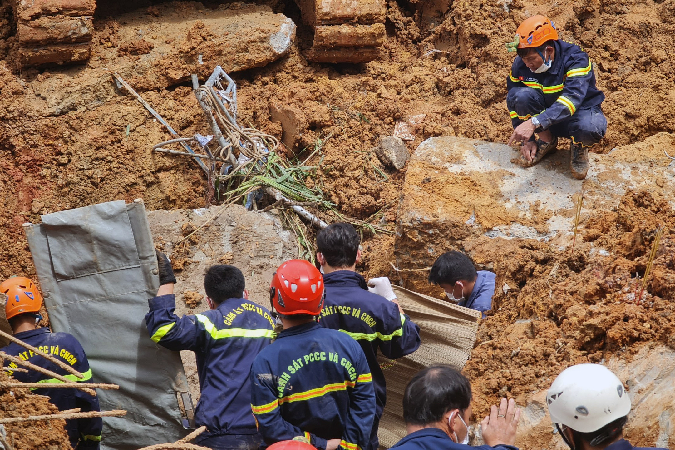Lực lượng chức năng đào bới tìm người mắc kẹt trong vụ sạt lở. Ảnh: N.X.