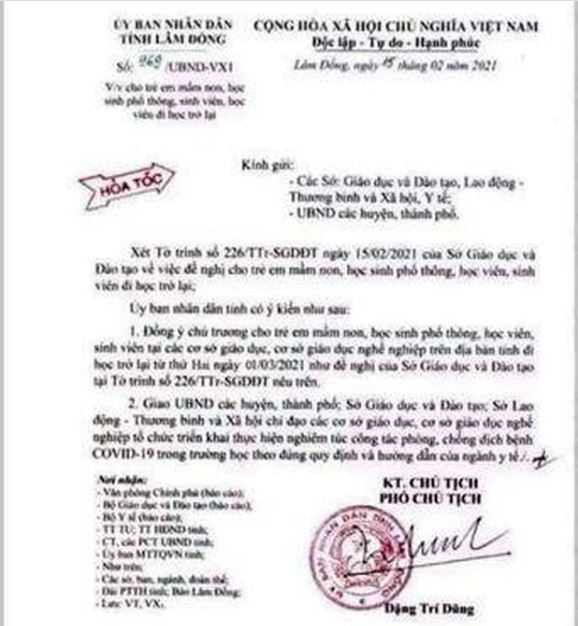 Trước đó, cùng ngày 16/2/2021, TTXVN đã đưa tin: Ngày 15/2, UBND tỉnh Lâm Đồng đã có văn bản hỏa tốc số 969/UBND-VX1, về việc cho trẻ em mầm non, học sinh phổ thông, sinh viên, học sinh đi học trở lại từ thứ Tư ngày 17/2/2021. Tuy nhiên sau đó, trên mạng xã hội lại xuất hiện 1 văn bản giống như văn bản trên, nhưng thời điểm đi học trở lại là “thứ Hai ngày 1/3/2021”.