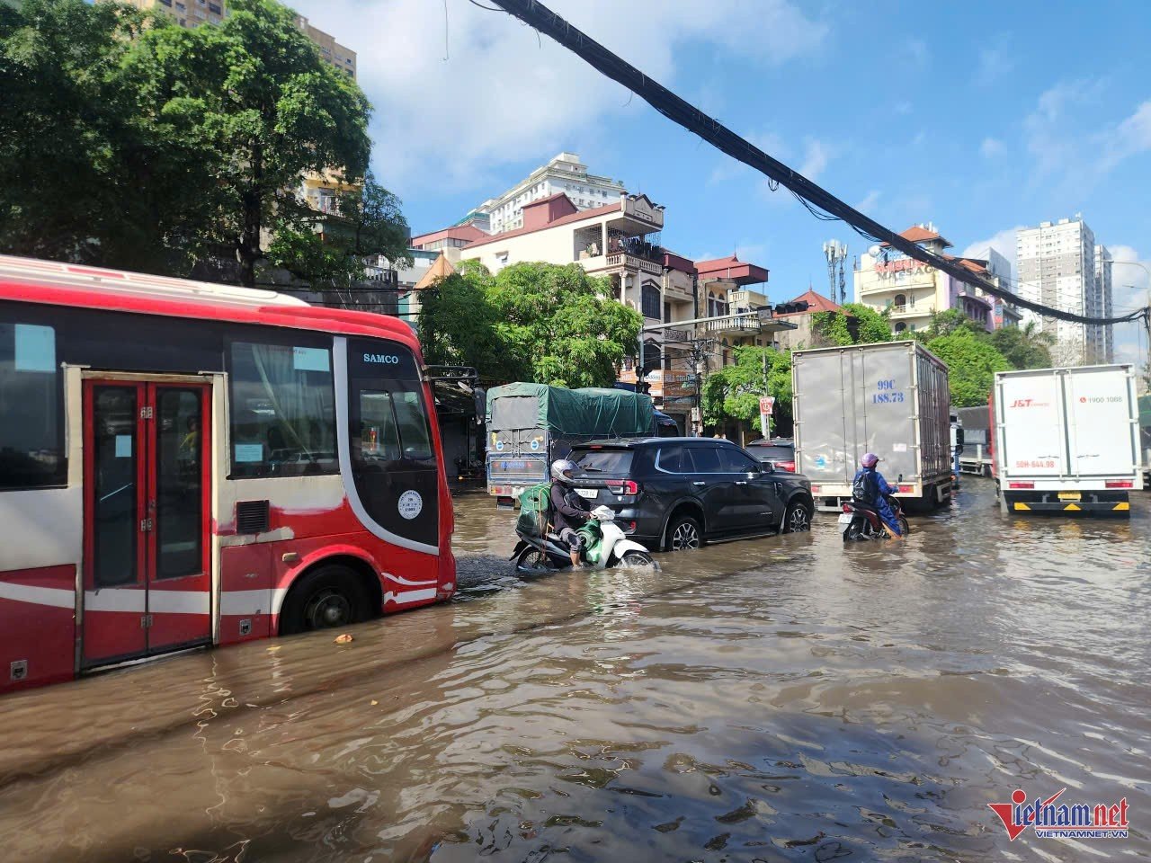 Chiều 2/10, ghi nhận tại ngã ba Cầu Bươu – Phạm Tu (trước cổng Bệnh viện K3 Tân Triều), nước vẫn ngập sâu hơn 60 cm. Người dân và phương tiện di chuyển hết sức khó khăn.