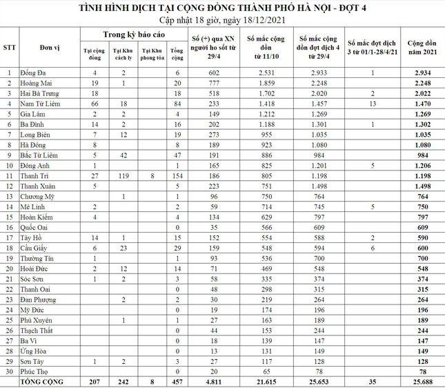 Cộng dồn trong đợt dịch 4 (từ ngày 29/4/2021), Hà Nội ghi nhận 25.653 ca mắc COVID-19, trong đó số mắc ghi nhận ngoài cộng đồng 9.765 ca, số mắc là đối tượng đã được cách ly 15.888 ca.
