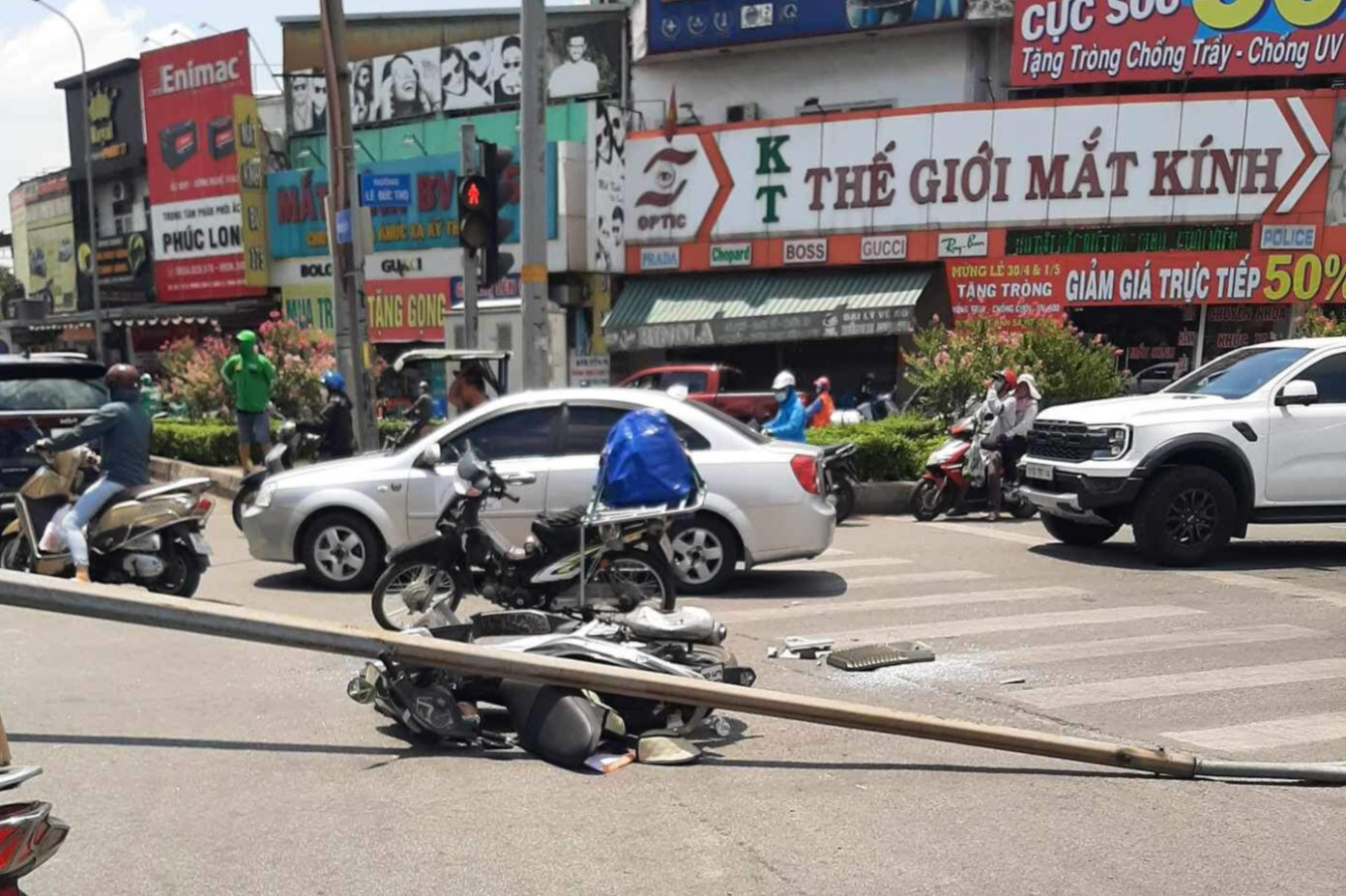 Một cô gái đi xe máy bị trụ đèn chiếu sáng đập trúng người bị thương, nằm trên đường. Số khác may mắn thoát nạn nhưng tinh thần hoảng loạn.