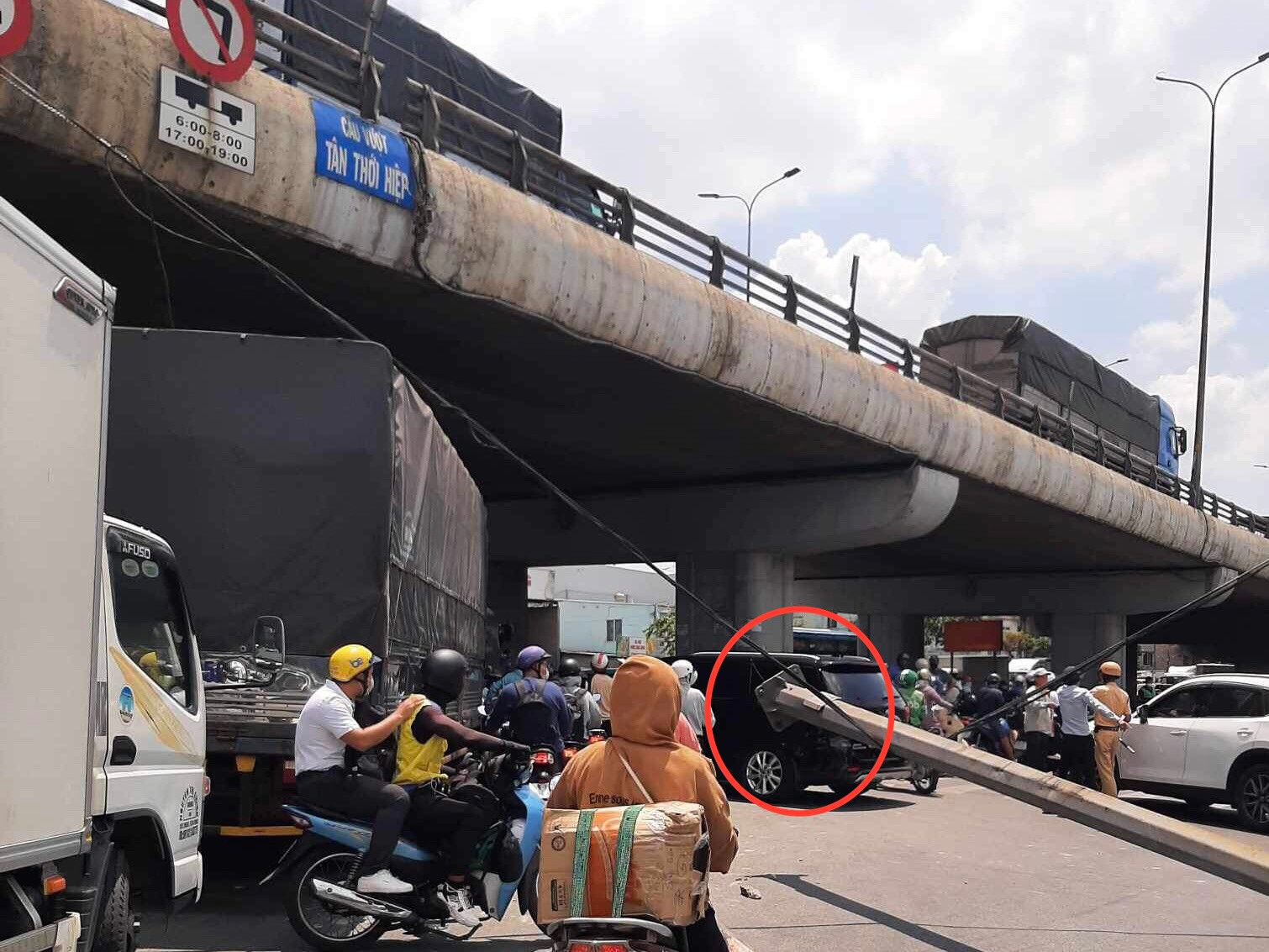 Nhiều người kinh hãi khi thấy một trụ đèn chiếu sáng được lắp trên cầu vượt Tân Thới Hiệp đổ ập từ độ cao hơn 5m xuống bên dưới đường.