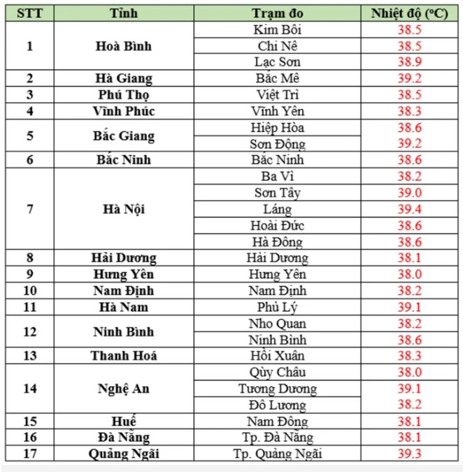 Ghi nhận lúc 13h, trạm khí tượng Láng (Hà Nội) đo được mức nhiệt lên tới 39,4°C – cao nhất cả nước. Nắng nóng bao trùm hầu khắp Bắc Bộ, một số điểm vượt ngưỡng 39°C, như :Bắc Mê (Hà Giang) và Sơn Động (Bắc Giang) 39,2°C; Hà Nam 39,1°C; Tương Dương (Nghệ An) 39,2°C; Quảng Ngãi 39,3°C…