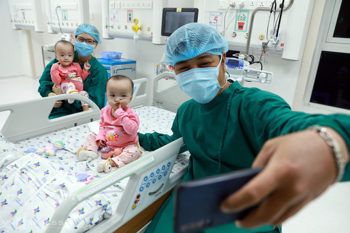Hoàng Trúc Nhi và Hoàng Diệu Nhi, nay tròn 14 tháng tuổi là chị em song sinh từng dính liền vùng bụng chậu, tư thế mặt đối mặt, kiểu cực kỳ hiếm gặp trên thế giới. Hai tháng trước, gần 100 y bác sĩ từ các bệnh viện lớn ở miền Nam đã tổ chức thành công ca đại phẫu thuật mổ tách hai bé.
