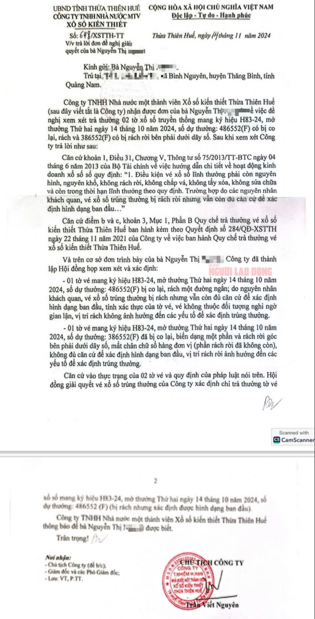Trong văn bản gửi cho bà Ng. ngày 14-11, Công ty XSKT Thừa Thiên – Huế nêu lý do không trả thưởng là "do đã bị co lại, biến dạng một phần và rách rời góc bên phải dưới dãy số, mất chân chữ số hàng đơn vị (phần rách rời đã không còn), không đủ căn cứ để xác định hình dạng ban đầu, vị trí rách rời ảnh hưởng đến các yếu tố để xác định trúng thưởng".