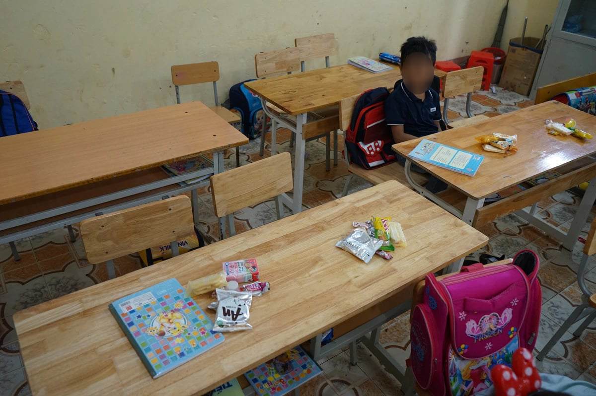Hoàng Quang Vinh - học lớp 1, vừa chuyển từ điểm trường Làng Nủ ra - vẫn chưa nguôi nỗi nhớ mẹ. Vinh thích nhất ăn xúc xích. "Lần đầu tiên cháu được ăn món này" - Vinh chia sẻ.