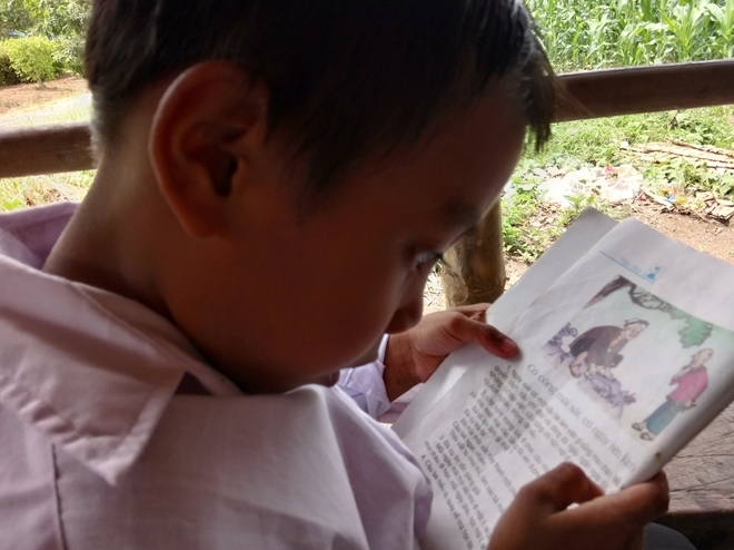 Gặp học sinh Nhi tại điểm trường, chúng tôi đưa cuốn sách giáo khoa lớp 2 bảo cháu đọc tên cuốn sách thì cháu lắc đầu, cho biết: “Con không đọc được”. Hỏi cháu biết viết không thì cháu cũng lắc đầu một cách tội nghiệp. Hỏi thêm: “Năm học lớp 1 thầy có kêu con đọc bài không” thì cháu trả lời “không”.