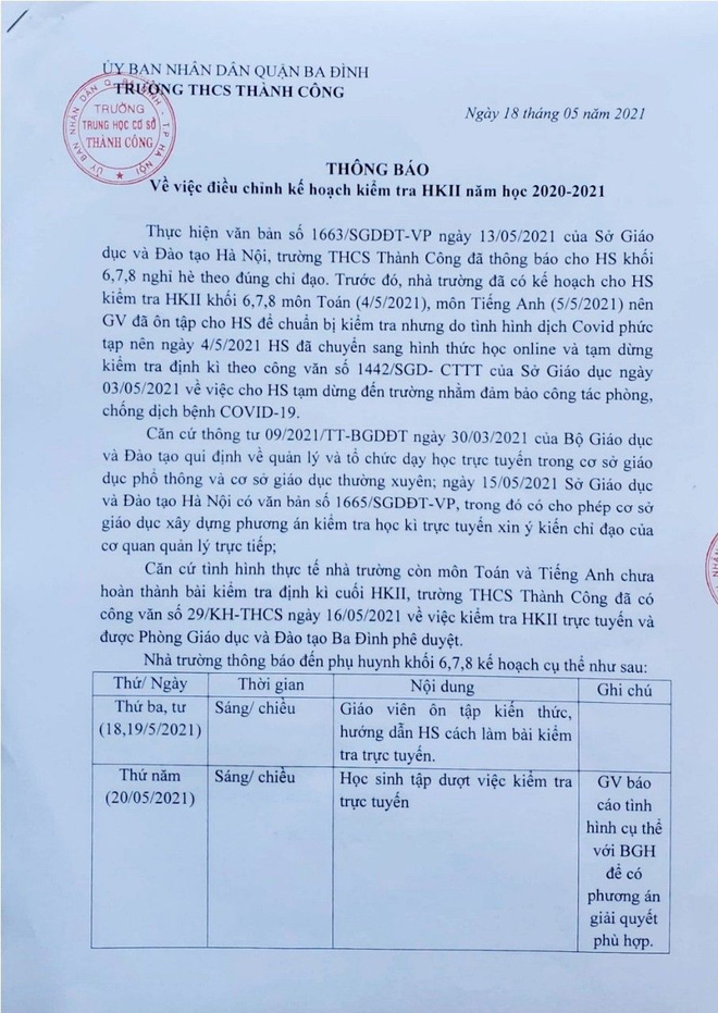 Dựa vào những hướng dẫn, chỉ đạo của Sở GD&ĐT Hà Nội về việc triển khai nhiệm vụ trọng tâm cuối năm học 2020-2021, mới đây, trường THCS Thành Công (quận Ba Đình) đã lên phương án cho học sinh khối 6, 7, 8 thi học kỳ trực tuyến từ 21/5 đến 26/5.