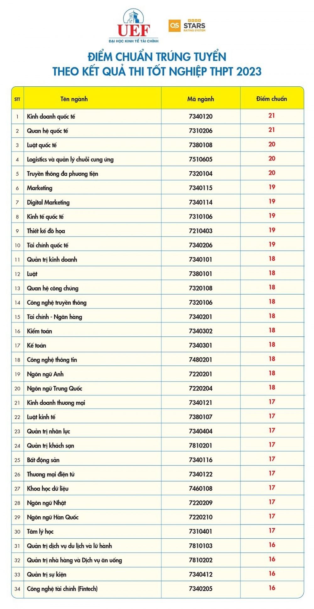 Năm nay, điểm chuẩn trúng tuyển theo phương thức xét kết quả tốt nghiệp THPT Trường Đại học Kinh tế - Tài chính TP.HCM (UEF) cao nhất là 21, gồm các ngành: Quan hệ quốc tế, Kinh doanh quốc tế.