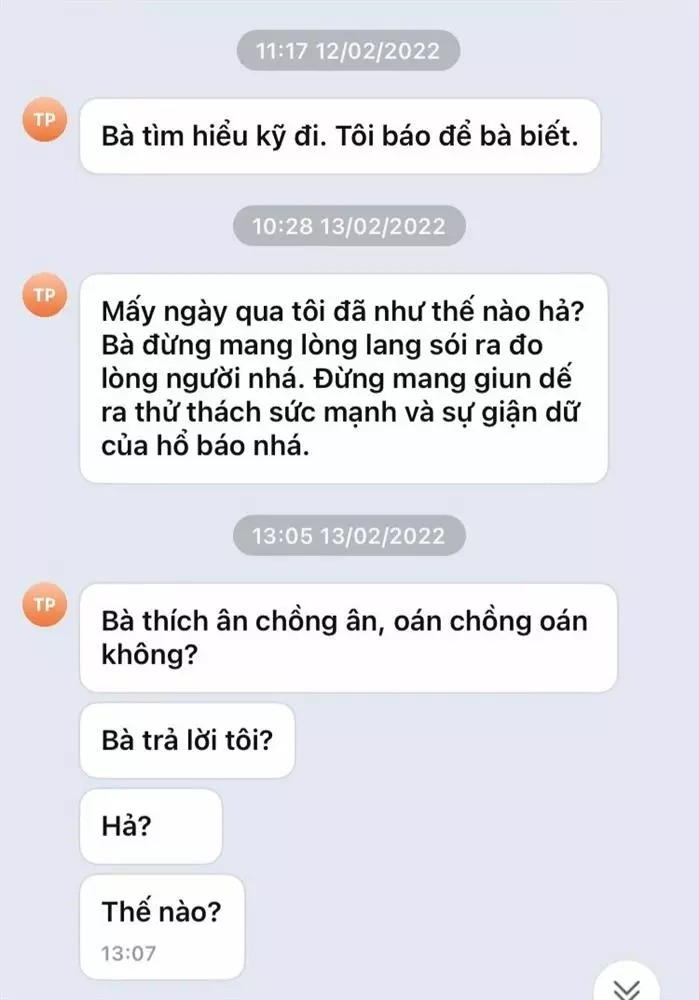 Những ngày sau đó, ông T. liên tiếp bạo hành tinh thần của chị H. qua tin nhắn, gọi điện thoại và gặp mặt trực tiếp, thậm chí ông T. còn nhắn tin khủng bố, đe dọa và thách thức mẹ chị H. bằng tin nhắn khi chị H. chặn số điện thoại của ông T..