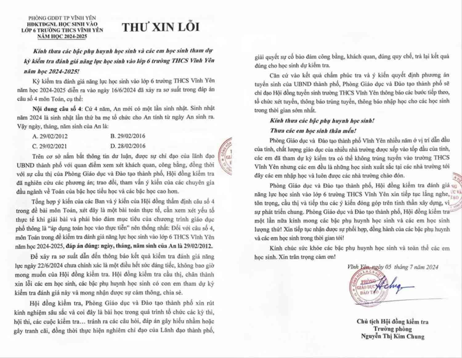 Trong thư xin lỗi, bà Nguyễn Thị Kim Chung cho biết, trong kỳ thi đánh giá năng lực học sinh vào lớp 6 Trường THCS Vĩnh Yên năm học 2024-2025 diễn ra ngày 16/6 vừa qua đã có sơ suất trong đáp án 1 câu, dẫn đến kết quả không chính xác.
