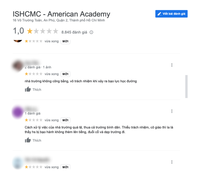 Hiện tại cư dân mạng vẫn chưa có dấu hiệu dừng lại và đang tràn vào đánh giá 1 sao nhiều hơn theo từng phút. Đa số cư dân mạng tỏ ra bất bình khi trường này bị phụ huynh tố “phủi bỏ trách nhiệm, cho rằng sự việc xảy ra ngoài khuôn viên nhà trường”.