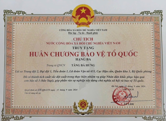 Theo thông tin từ Cục Tuyên huấn (Tổng cục Chính trị Quân đội nhân dân Việt Nam), ngày 13-9, Tổng Bí thư, Chủ tịch nước Tô Lâm đã ký quyết định truy tặng Huân chương Bảo vệ Tổ quốc hạng Ba cho Trung tá quân nhân chuyên nghiệp Tăng Bá Hưng vì đã có thành tích xuất sắc đột xuất trong thực hiện nhiệm vụ giúp nhân dân khắc phục hậu quả cơn bão số 3.