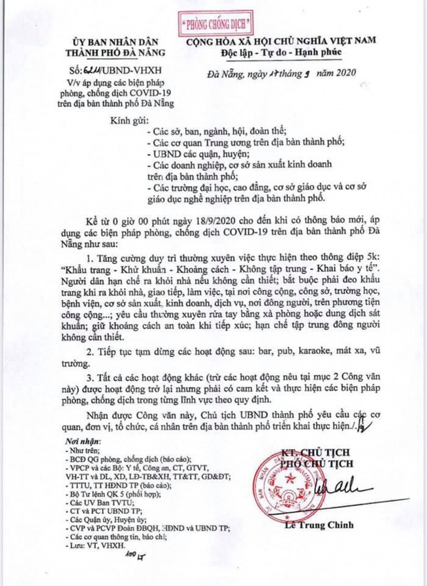 Theo văn bản này, từ 0 giờ ngày 18/9, Đà Nẵng sẽ cho mọi hoạt động trở lại bình thường; Tiếp tục tạm dừng các loại hình dịch vụ không thiết yếu là quá bar, pub, karaoke, massage, vũ trường.