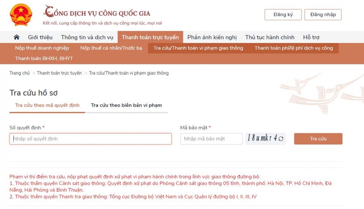 Bước 6: Thông qua Cổng Dịch vụ công quốc gia, người vi phạm có thể hoàn thành việc nộp tiền phạt, đăng ký địa chỉ để nhận lại giấy tờ do cơ quan cảnh sát giao thông đang tạm giữ sau khi đã chấp hành xong quyết định xử phạt.