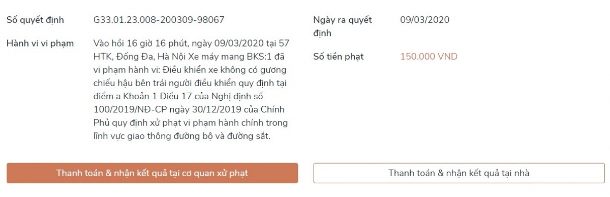 Tuy nhiên, với hình thức này, người dân chỉ tra được thông tin về lỗi vi phạm, mức tiền nộp phạt, còn việc làm thủ tục và đi nộp phạt vẫn phải đến trụ sở công an.