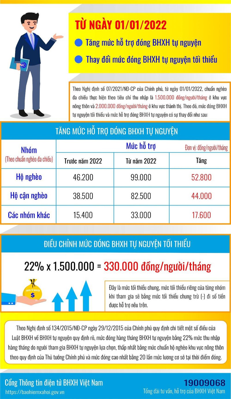 Theo BHXH Việt Nam, từ ngày 1/1/2022, căn cứ quy định chuẩn nghèo đa chiều giai đoạn 2021-2025 tại Nghị định số 07/2021/NĐ-CP ngày 27/1/2021 của Chính phủ, mức chuẩn nghèo của khu vực nông thôn tăng từ 700.000 đồng lên 1.500.000 đồng/tháng. Như vậy, mức hỗ trợ của Nhà nước và mức đóng bảo hiểm xã hội tự nguyện tối thiểu năm 2022 sẽ thay đổi phù hợp thực tế.