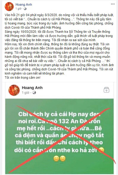 “Tôi muốn gửi lời xin lỗi chân thành đến chính quyền thành phố và toàn thể cộng đồng mạng. Tôi mong nhận được sự thông cảm và tha thứ của mọi người cho hành động nông nổi, nhất thời. Tôi đã gỡ bỏ thông tin và mong muốn những ai đã chia sẻ bài viết thì gỡ bỏ giúp tôi để tránh bị vi phạm pháp luật và ảnh hưởng đến uy tín, hình ảnh và công tác phòng, chống dịch COVID-19 của thành phố Hải Phòng“, chị Hoàng Anh nói.