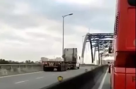 Nhiều người đi xe máy và xe khách buộc phải tránh né container này. Vụ việc được một tài xế chạy trên cầu ghi lại được và đăng tải lên mạng xã hội gây xôn xao.