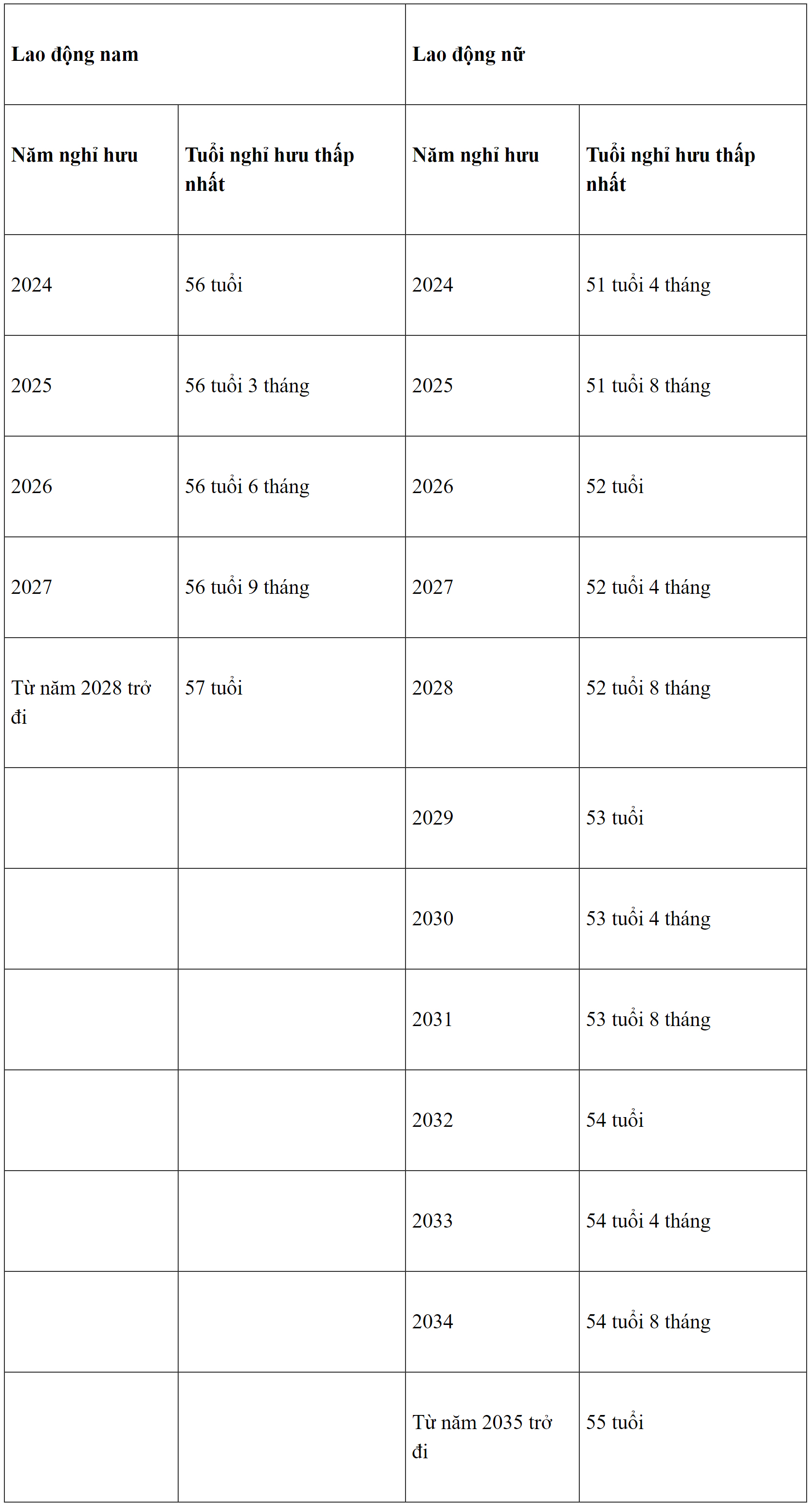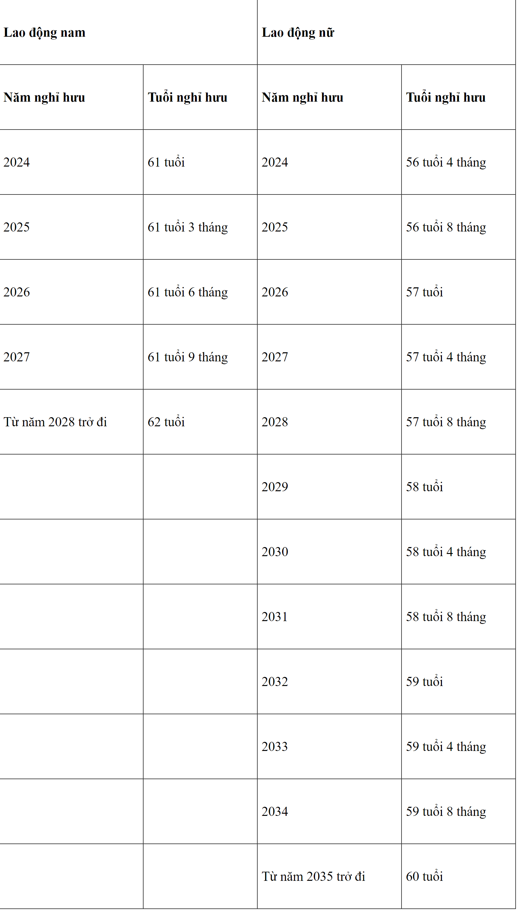 Theo đó, vào năm 2024 độ tuổi nghỉ hưu của người lao động nam sẽ là 61 tuổi, lao động nữ sẽ là 56 tuổi 4 tháng.