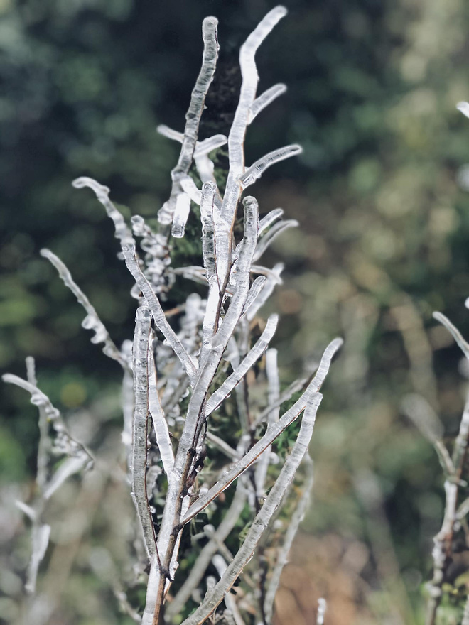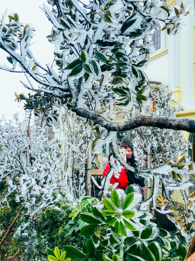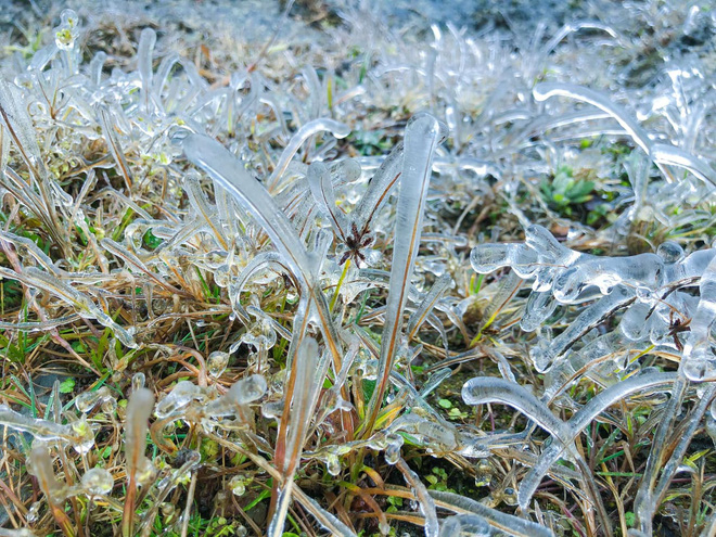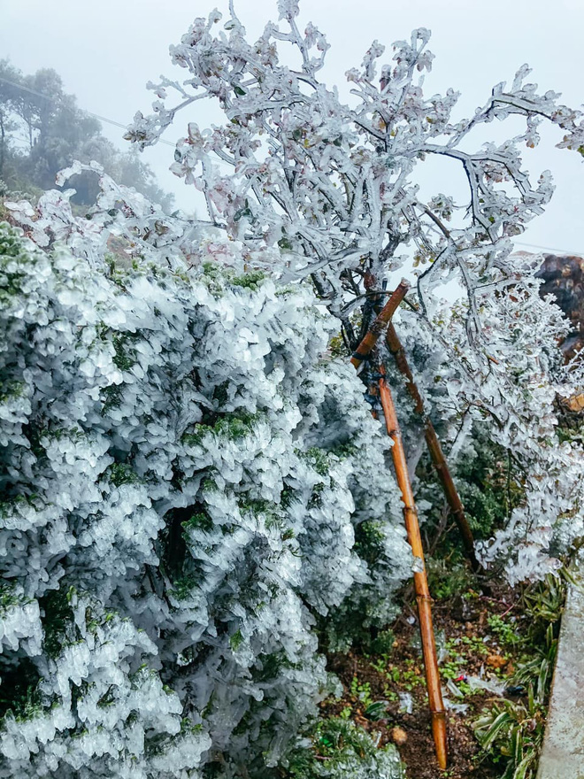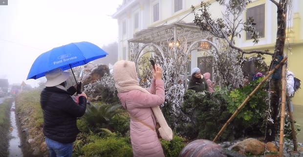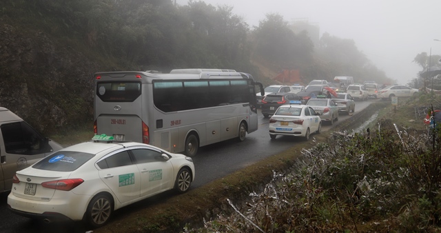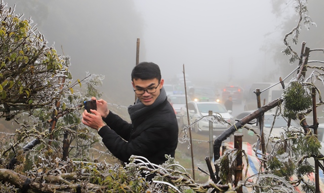 Băng tuyết phủ kín cành cây, ngọn cỏ khu vực giáp ranh giữa tỉnh Lào Cai và Lai Châu. Nhiều du khách đến Sa Pa để ngắm tận mắt nên xảy ra tình trạng ách tắc giao thông trên đoạn đường đèo.