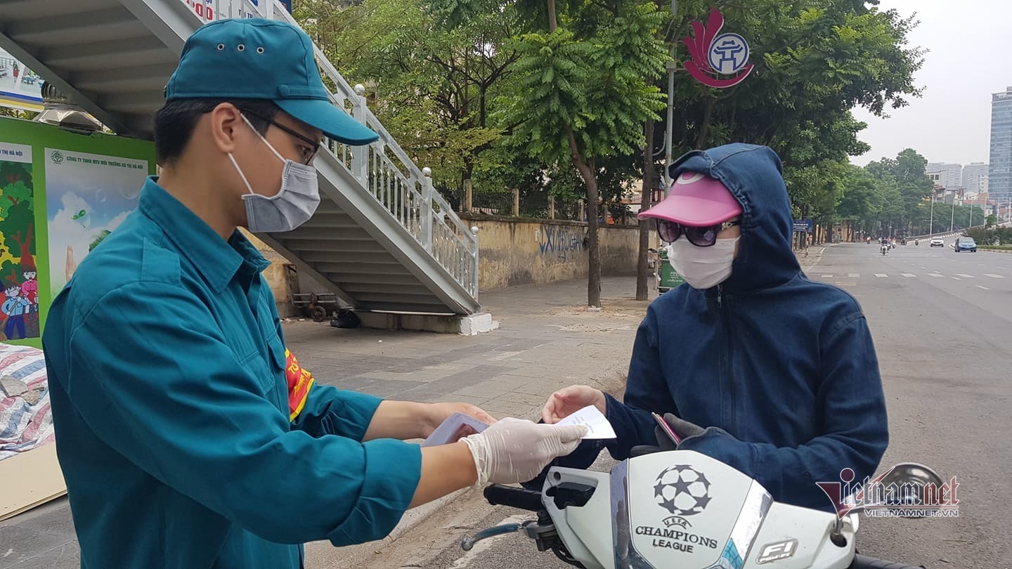 Tại chốt kiểm soát phố Đào Tấn, cán bộ trực chốt tuyên truyền, nhắc nhở người dân chuẩn bị giấy tờ theo yêu cầu mới của UBND TP.