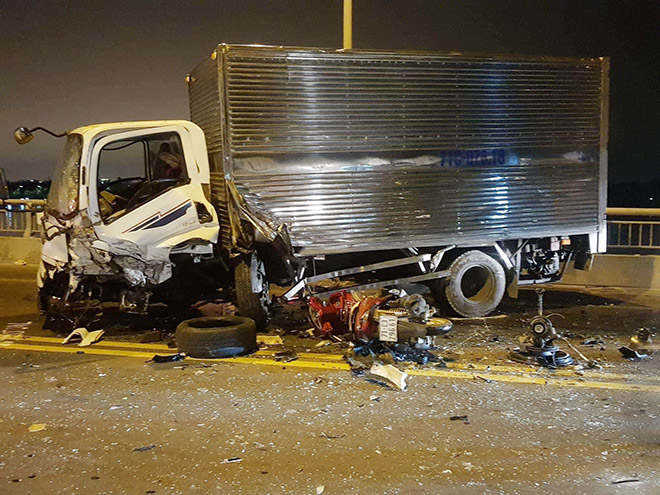 Tại hiện trường, đầu chiếc xe bốn chỗ biển số 71A-04... bẹp dúm, chiếc xe này xoay ngang sau cú tông trực diện với xe tải chạy hướng ngược lại. Đầu xe tải cũng bị móp méo, một bên hông cabin bị xé toạc, nhiều bộ phận xe vương vãi trên đường, cạnh đó là hai chiếc xe máy bị hư hỏng.