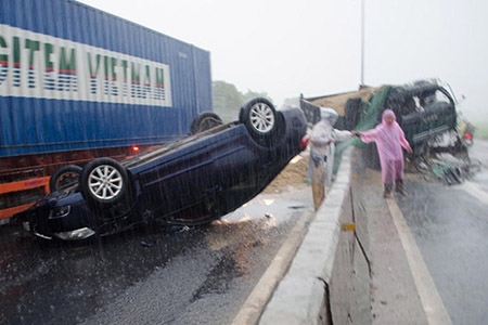 Cú va chạm mạnh khiến chiếc Camry leo lên dải phân cách trước khi lật ngửa trên đường quốc lộ. Trong khi đó, chiếc xe tải mất lái và đâm vỡ dải phân cách, lao qua làn đường ngược chiều rồi đâm vào hai người đang đi xe đạp.