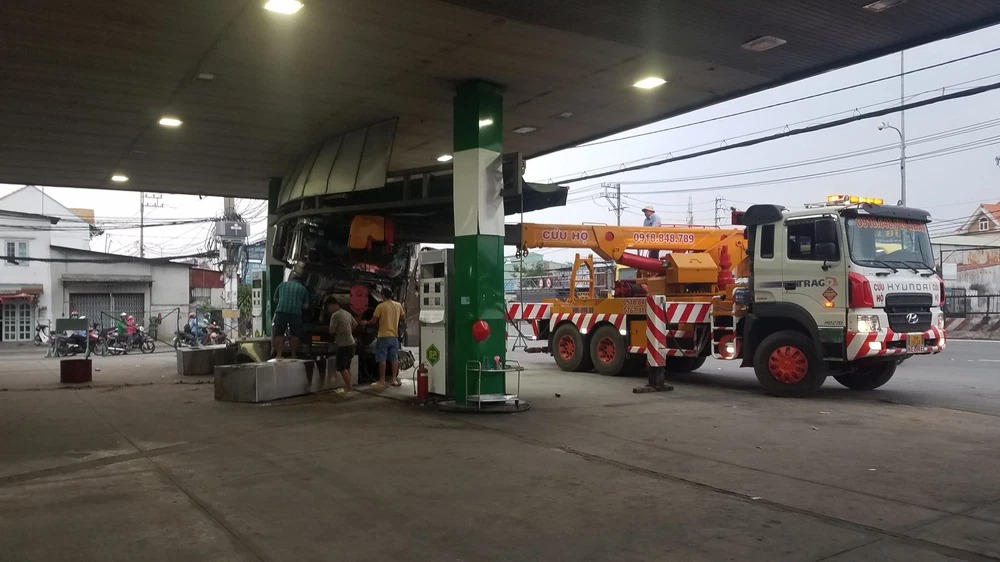 Cú tông mạnh, khiến xe tải lao về phía trước húc đổ đèn tín hiệu giao thông và hai trụ bơm cây xăng cách đó 50 m. Theo nhân viên cây xăng, khi xảy ra tai nạn không có người đổ nhiên liệu. "Xe tải lao vào rất nhanh, cũng may trụ bơm không phát nổ", nhân viên cây xăng nói.