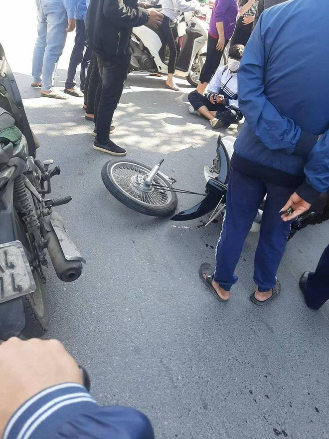 Nam sinh sau vụ va chạm ngồi xếp bằng giữa đường, có vẻ sợ hãi. Vụ việc đã thu hút sự chú ý của người đi đường cũng như người dân xung quanh.