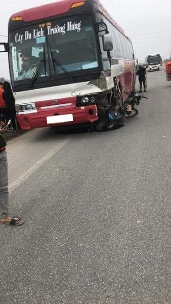 Sau cú va chạm mạnh, chiếc xe máy lao vào gầm xe khách, vỡ vụn. Hai người ngồi trên xe máy văng ra xa, tử vong tại chỗ.