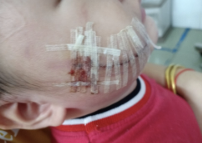 Con chó bị giật mình nên cắn vào vùng mặt của bé. Sau khi sơ cứu vết thương em được bác sĩ khoa Răng hàm điều trị tích cực.