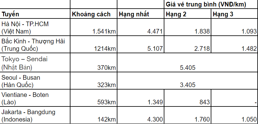 Bảng so sánh giá vé trung bình trên mỗi km đường sắt tốc độ cao ở Việt Nam và một số quốc gia ở Châu Á: