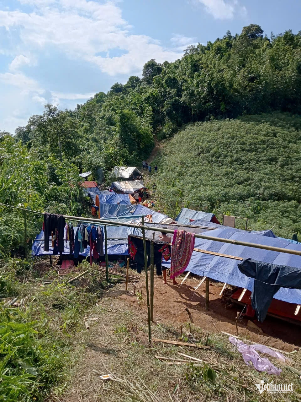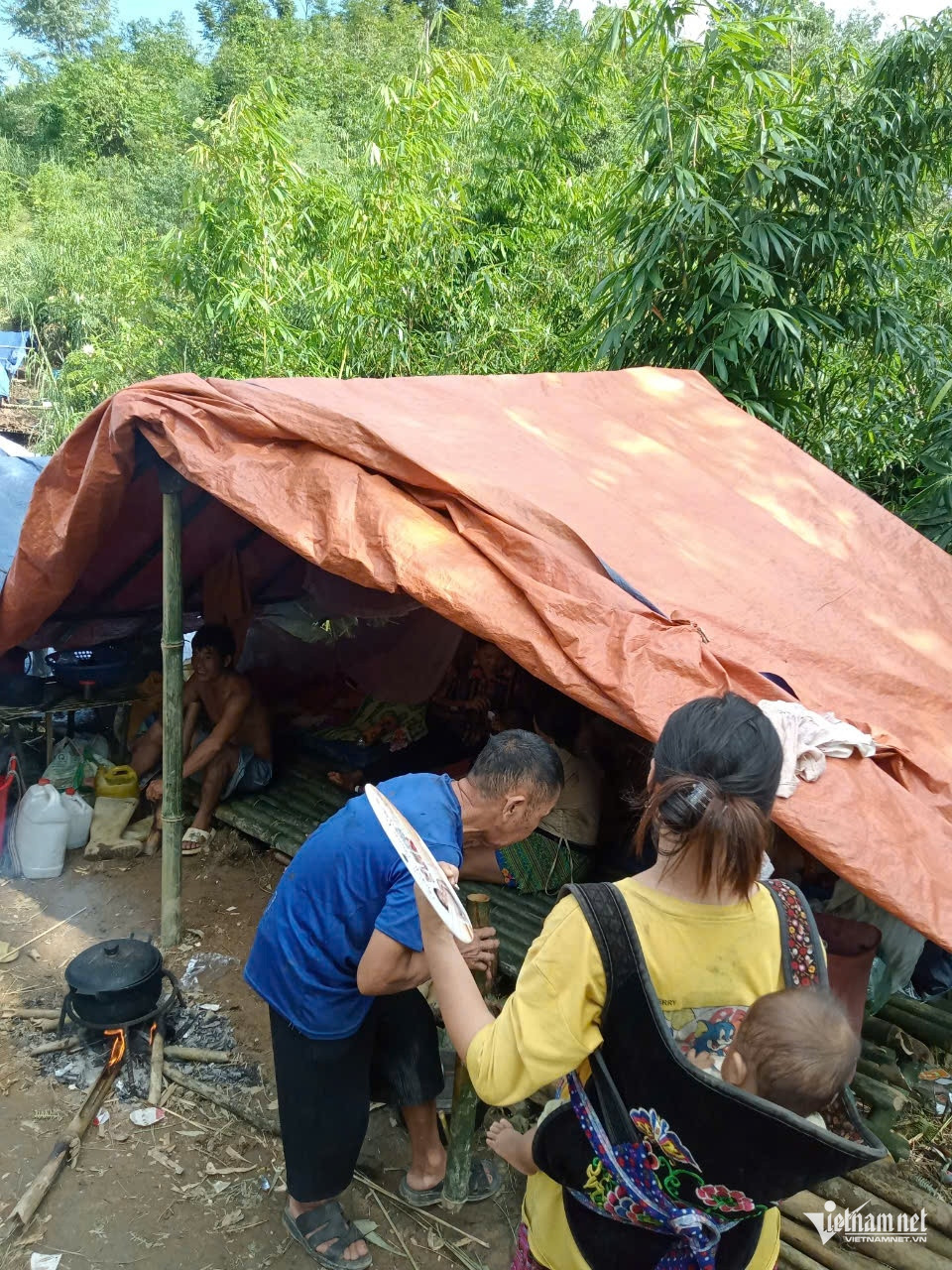 Sau khi được trưởng thôn tuyên truyền, vận động, khoảng 12h ngày 9/9, 17 hộ dân bắt đầu di chuyển giữa trời mưa. Người dân vừa đi vừa đợi, hỗ trợ nhau, những người khoẻ mạnh được giao nhiệm vụ vác gạo. Sau 30 phút đi bộ, các hộ dân đã đến nơi dựng trại.