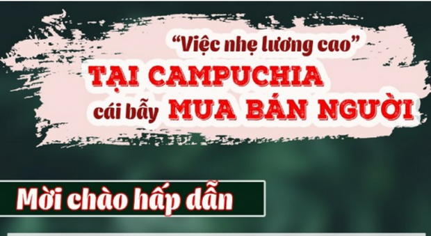 "Việc nhẹ lương cao" là những câu từ mà các đối tượng buôn bán người đang hàng ngày rêu rao tràn lan trên các trang mạng xã hội. Dù không biết thực hư như thế nào mà hàng trăm người nhẹ dạ cả tin đã bị lừa bán sang Campuchia bị cưỡng bức, bóc lột sức lao động, buộc phải làm việc 11-15 giờ/ngày, bị ngược đãi, đánh đập thậm chí bị chủ công ty mua bán sang công ty khác.... Muốn về nước các nạn nhân phải gọi cho gia đình nộp hàng trăm triệu đồng để chuộc người.
