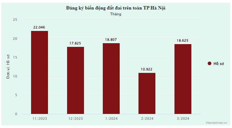 Số liệu từ Chi nhánh Văn phòng đăng ký đất đai quận Hà Đông cho thấy, trong quý I/2024, tổng số hồ sơ văn phòng tiếp nhận là hơn 7.400 hồ sơ, thấp hơn quý IV/2023 với gần 7.900 hồ sơ. Trong đó, số hồ sơ đăng ký giao dịch đảm bảo và biến động đất đai lần lượt là 3.385 và 3.990 hồ sơ.